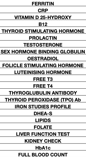 The Full MOT is our most thorough blood test. This is a fully comprehensive health screen which investigates the whole range of inflammatory markers (including C-RP), deficiencies such as Iron and B12 as well as infection. These are the foundational elements which if not managed will delay or negate any chance of healing at a cellular level.